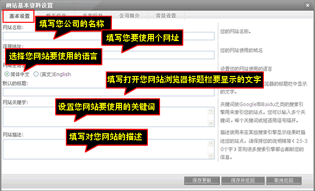 基本设置主要是填写网站名称、连接地址、网站主语言、默认的标题、网站关键字、网站描述,填写完后记得点击“保存更新”。