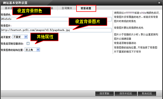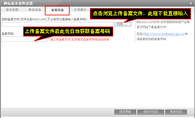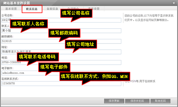 联系信息主要填写公司名称、联系人、邮政编码、地址、电话、电子邮件、在线联系方式,填写完后记得点击保存更新。